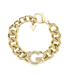 Pulsera de acero para mujer de la marca Guess. Pulsera dorada de cadena gruesa y G como icono principal decorada con pedrería. La icónica G de la marca es el motivo principal de la colección G Crystal, perfecta para deslumbrar.