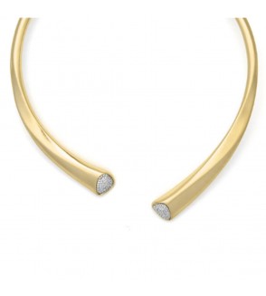 Este collar Leito, elaborado en aleación de metal con acabado en oro amarillo de 18 kilates, destaca por su diámetro de 13 cm y su cierre de muelle que garantiza seguridad y comodidad