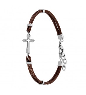 Pulsera de algodón marrón con cruz de acero y componentes de acero.