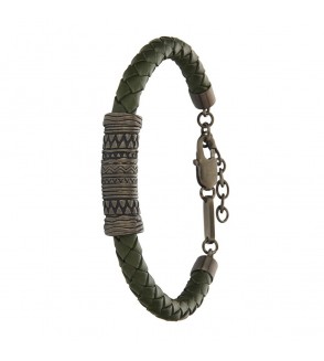 Pulsera para hombre en acero envejecido y piel color verde. Largo pulsera 21,5 cm . Ancho del centro 9.70 mm ancho de correa una tira de piel trenzada en color verde 6,00 mm de diámetro