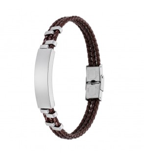 Pulsera de cuero marrón con placa y componentes en acero brillante.
