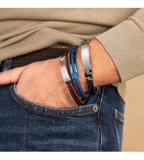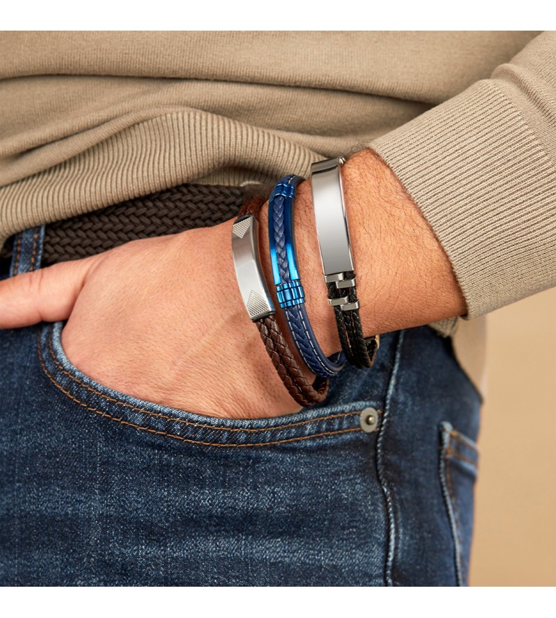 Pulsera de cuero negro con placa y componentes en acero brillante.
