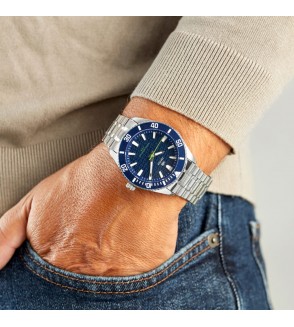 - Material Caja: Metal con bisel azul oscuro, con tapa trasera y corona de acero.