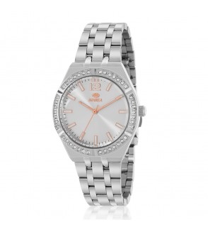 - Material Caja: Metal con pedrería en bisel, con tapa trasera y corona de acero.