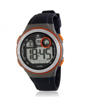 - Material Caja: Plástico color gris oscuro con bisel plateado y detalles en naranja.