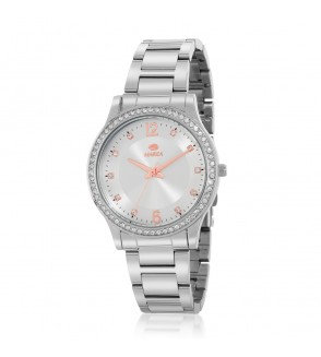 - Esfera: Color plateado con índices de pedrería y agujas color rose gold.