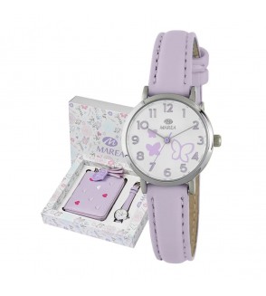 Reloj Marea Niña B41436/6. Presenta una caja de acero inoxidable de tamaño compacto con una correa de piel en color morado, aportando comodidad y un toque de color que combina con diferentes estilos. El movimiento de cuarzo analógico de 3 agujas garantiza una lectura de hora precisa y sin complicaciones, mientras que su cristal mineral protege la esfera frente a arañazos y uso cotidiano. Incluye cartera de regalo.