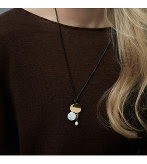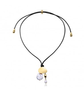 Collar de mujer de acero Ip dorado y cordón negro con perlas naturales