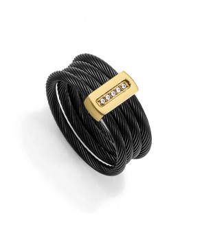 - Anillo de mujer de acero Ip negro y dorado múltiples cables unidos con barra con circonitas